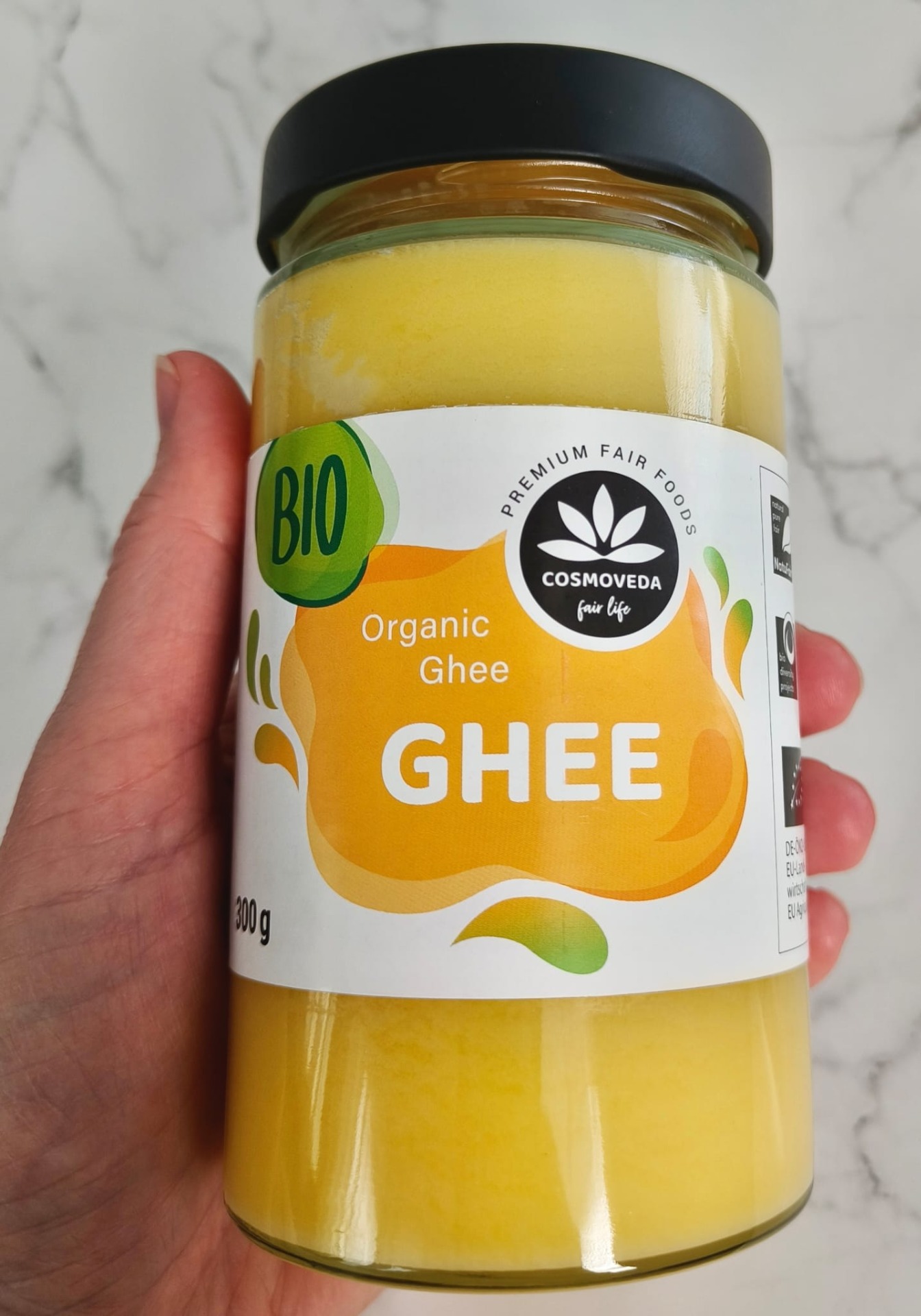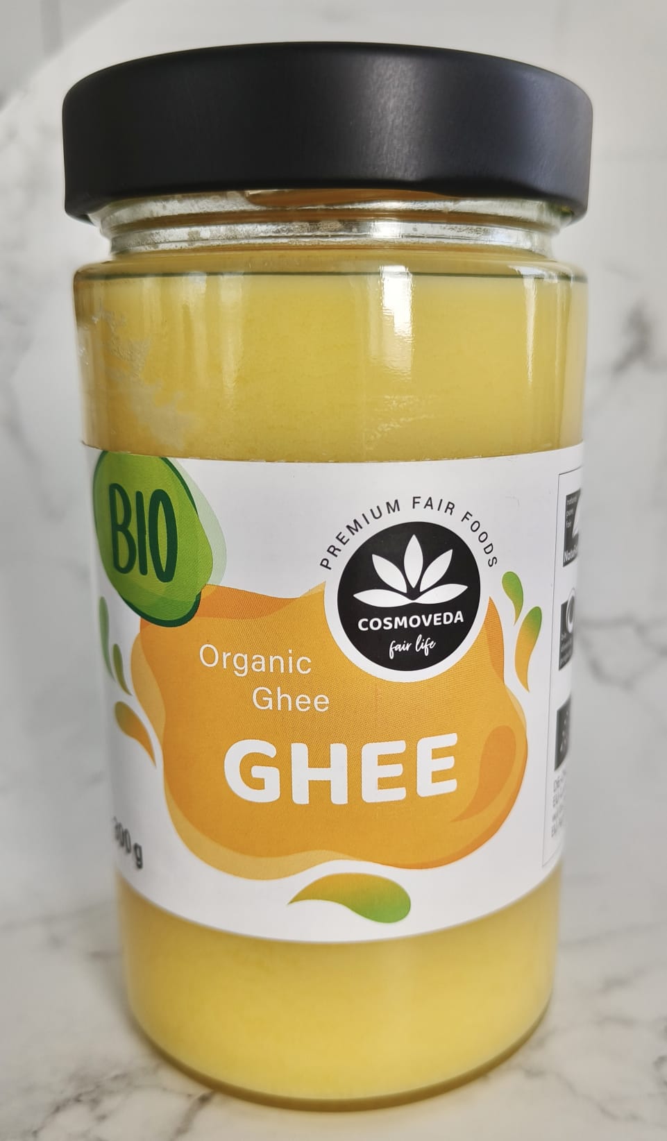 Cosmoveda premiumlaatuinen luomu ghee on kirkastettua voita, joka valmistetaan luomumaidosta perinteisiä ayurvedisia menetelmiä kunnioittaen. Hidas keittäminen ja huolellinen puhdistus poistavat maidon proteiinit ja laktoosin, jolloin jäljelle jää puhdas, aromikas maitorasva, jota ayurveda pitää sattvisena ja kehoa ravitsevana.